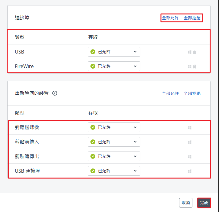※ 當卸除式裝置、加密的卸除式裝置、印表機或藍牙裝置連接至 USB 連接埠時,允許存取該裝置將優先於在 USB 介面層級設定的拒絕存取。如果您允許這種裝置類型,則無論是否拒絕存取 USB 連接埠,都允許存取裝置。
