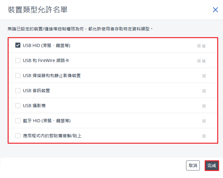※ 僅 Windows 支援此裝置類型,如果在 macOS 上使用的保護計劃的設定適用於僅在 Windows 上受支援的裝置類型,則在 macOS 上將忽略這些裝置類型的設定。