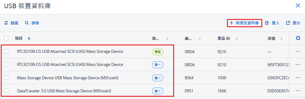 若要新增特定USB裝置,請點選新增置資料庫。針對每個裝置,清單都會提供下列資訊: